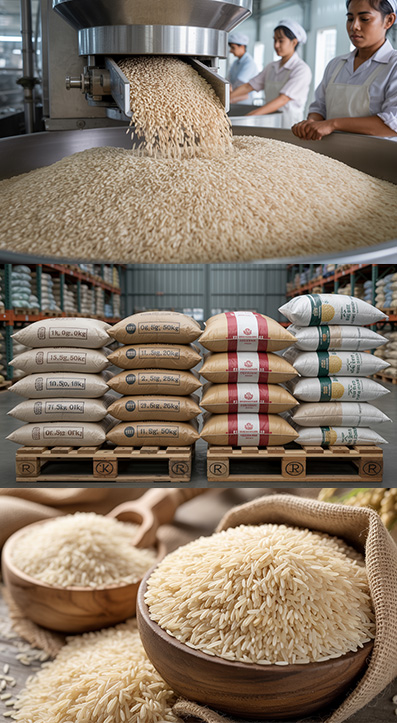 Rice is packed in 1kg to 50kg sizes using cotton, paper, PP, and polythene bags, ensuring freshness and quality retention.